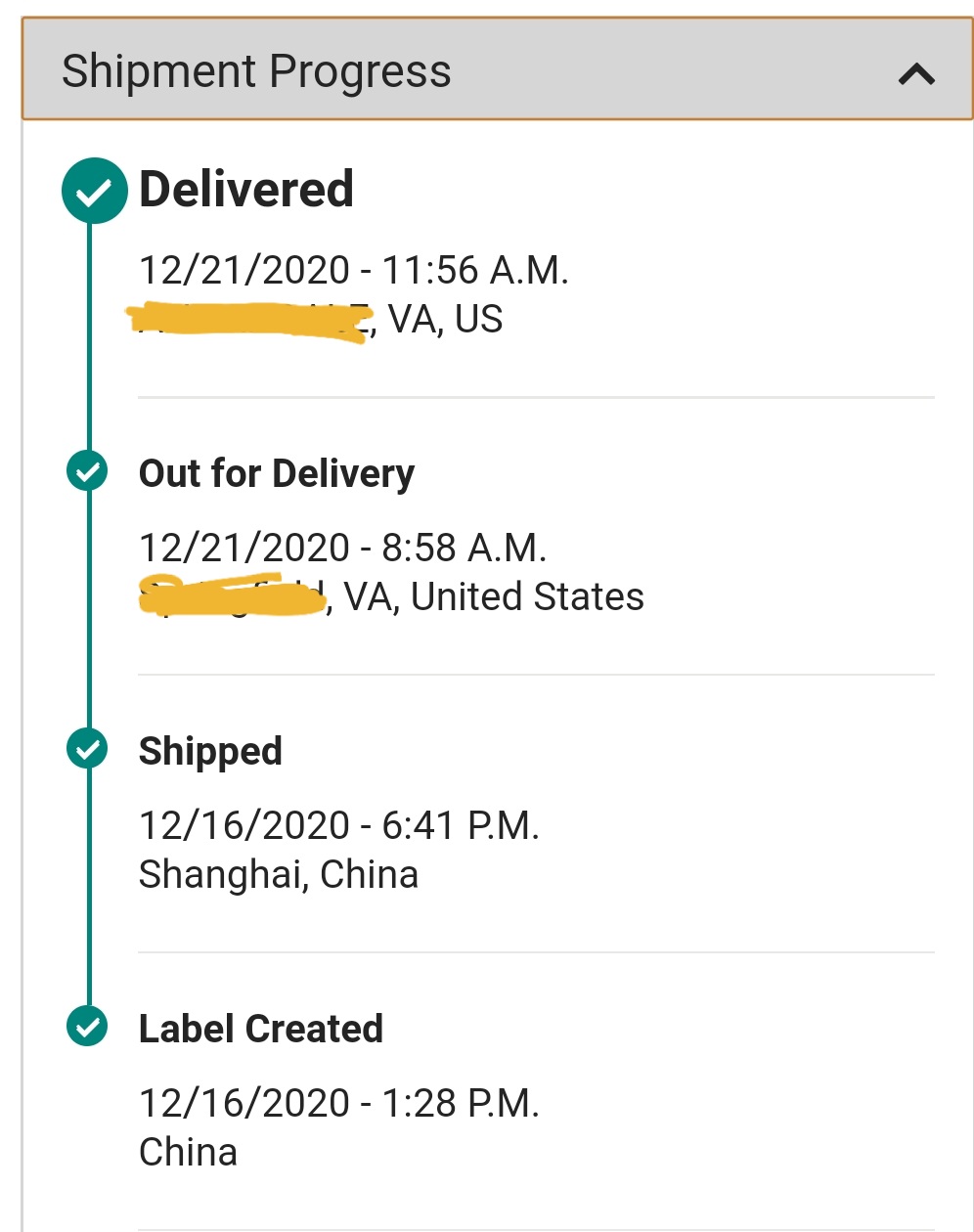 shipped 2020-12-17 17:00 Shanghai China