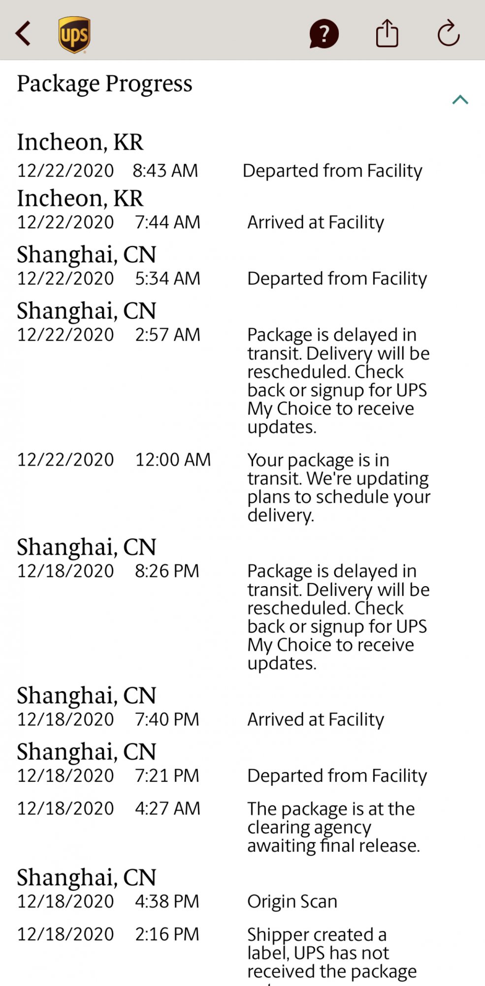 Mine looks exactly the same as yours. On UPS site it says Anchorage 10:36pm as the latest update. Doesn’t say anything about Incheon on UPS. But on Parcelapps.com I tracked it and it gave a much more detailed view of all the stops it made. I have no idea why UPS does not supply these? Check your order on there. According to that mine went through Incheon too and then to Anchorage. But hasn’t left Anchorage yet.