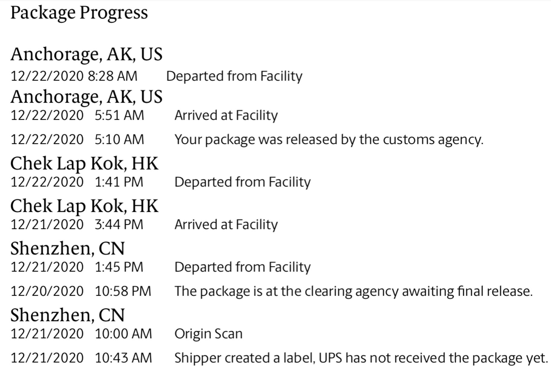 My MBP left Korea @ 10:10am Dec 22, 2020 and arrived at Anchorage at 22:36 Dec 21,2020. The time zone difference through me for a loop. Hopefully it will be departing Alaska later today.