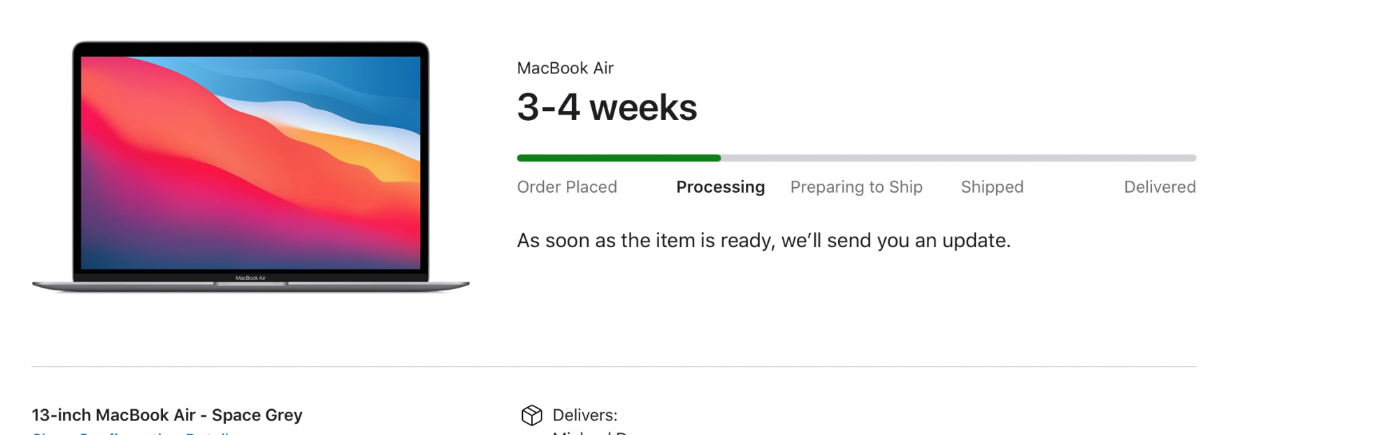 Status for my MBP Silver 16/1TB just changed to Preparing to Ship, might get it delivered next week!!