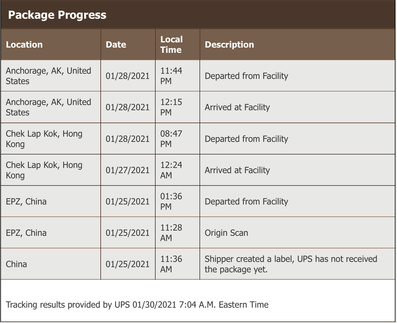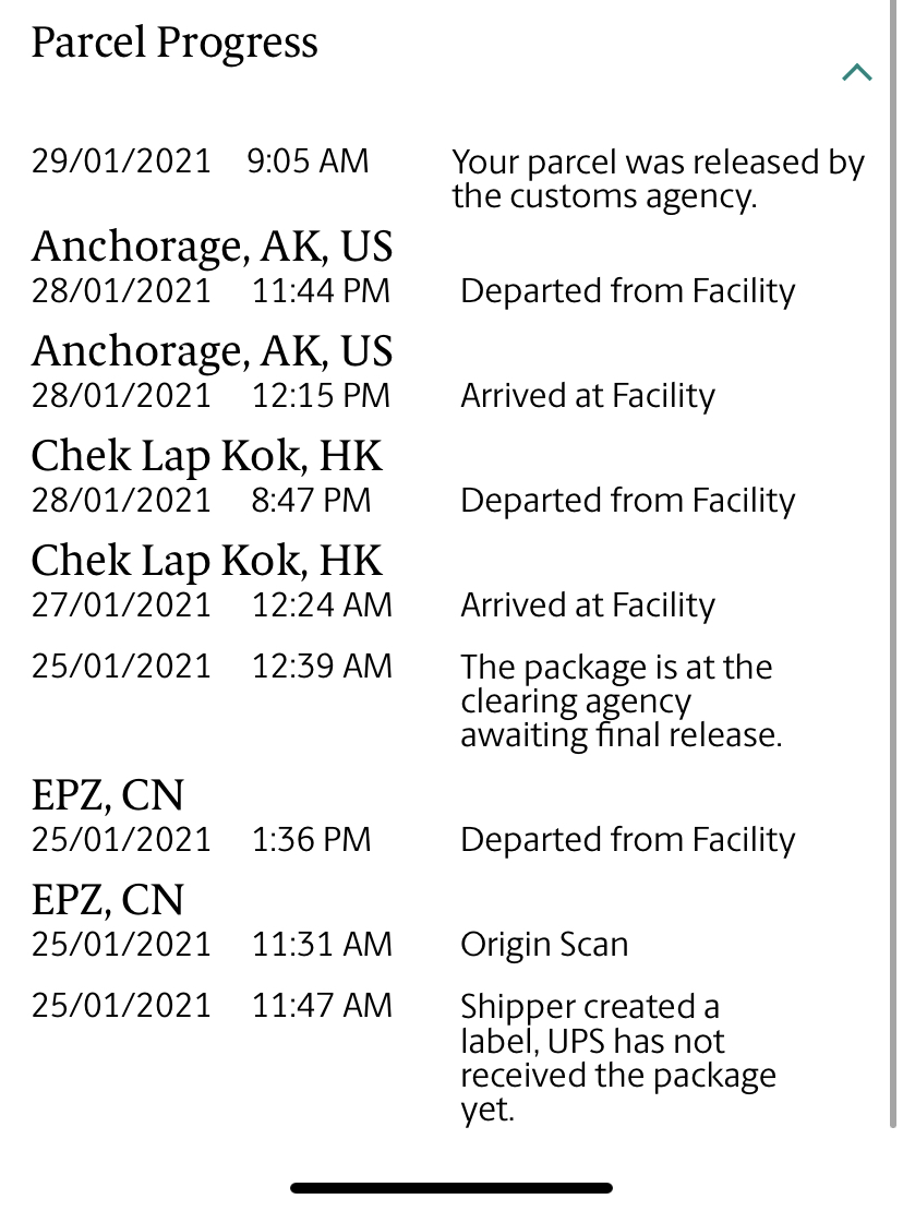 You should get a new time stamp and details when it lands somewhere else.Cleared in customs already but I don’t know where is the package right now 🤣 I tried searching for a UPS flight that left AK at 11:44PM to no luck. Guess I’ll wait for the next status update then.