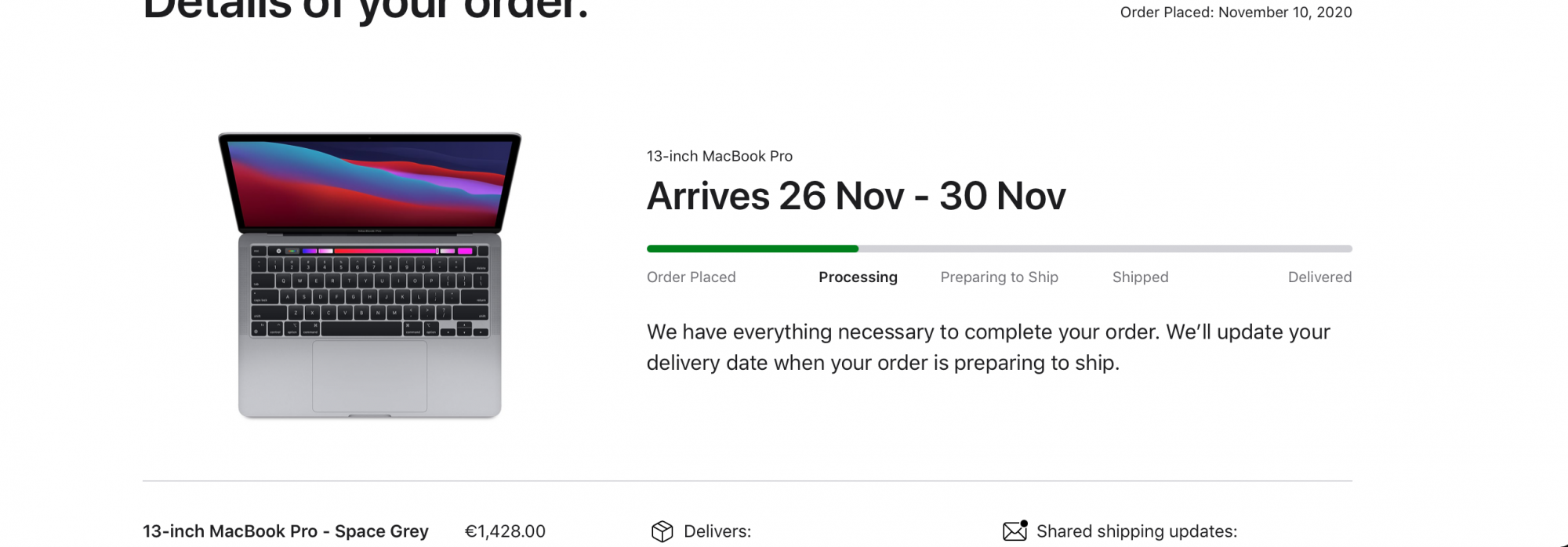 Ordered in India on 11th. Still processing. F*** you guys. Lol.I ordered a MBP 512GB with 16GB of Unified Memory to replace my MBA 2018. 26-30th Nov in Ireland