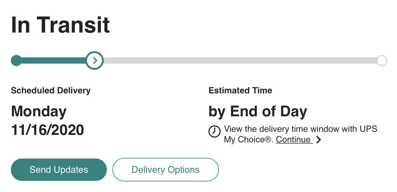 UPS says between 2:30 - 6:30 p.m. for me ( Usually between 5:00 - 6:00 p. m. deliveries here.)