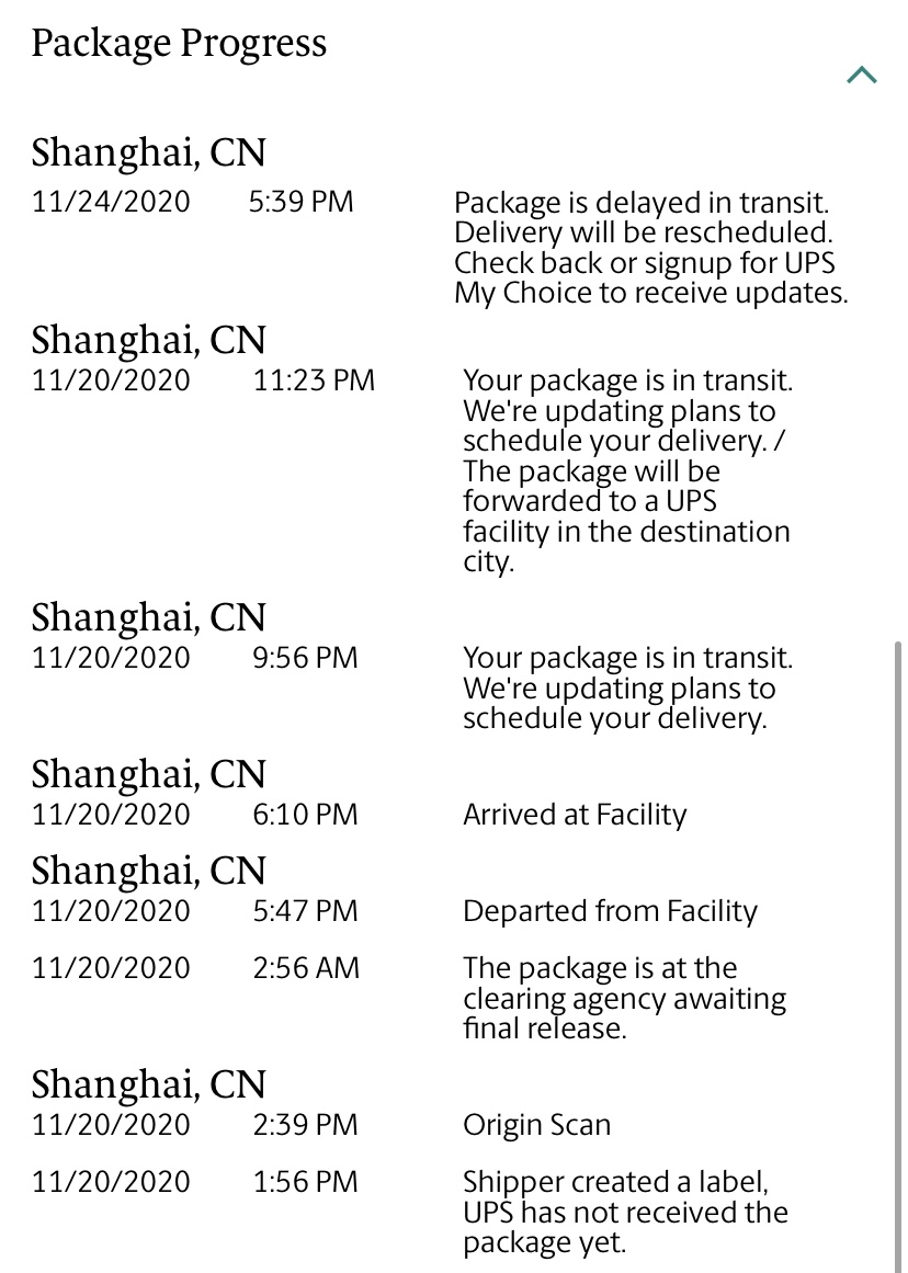 As with the rest of the gang my UPS status is stuck since November 24 (in transit):