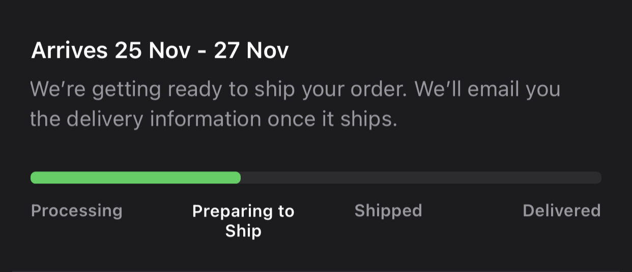I ordered a 16GB/512GB Air that just switched to “preparing to ship” today (the charge hit my card, as well). Perhaps that means it will arrive by the end of next week.Anecdotally, it seems like the majority of people who ordered base models have shipped or are preparing to ship, while the majority of the upgrades (as much as you can call 16 GB of RAM an upgrade in a "Pro" machine!) are still "processing".