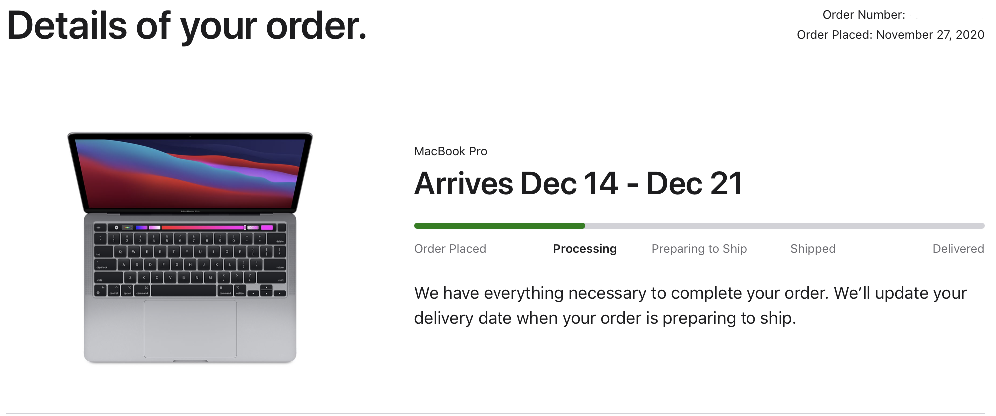 Let us know if you find out anything interesting please!Basically same boat here, except 16GB MBP. I'm on hold with Apple now getting passed up the support chain. The first rep said my order still showed a delivery date for today and offered to cancel my order with a Dec 22nd ship date, but I asked her not to unless she had a tracking number. Then she noted the shipping issues and went ahead and elevated me. Trying to be patient, but it's frustrating that those of us that ordered on launch date end up so far down the queue because we got unlucky with (1) an order routed through UPS instead of FedEx and (2) the only orders that hit a snag in Shanghai.