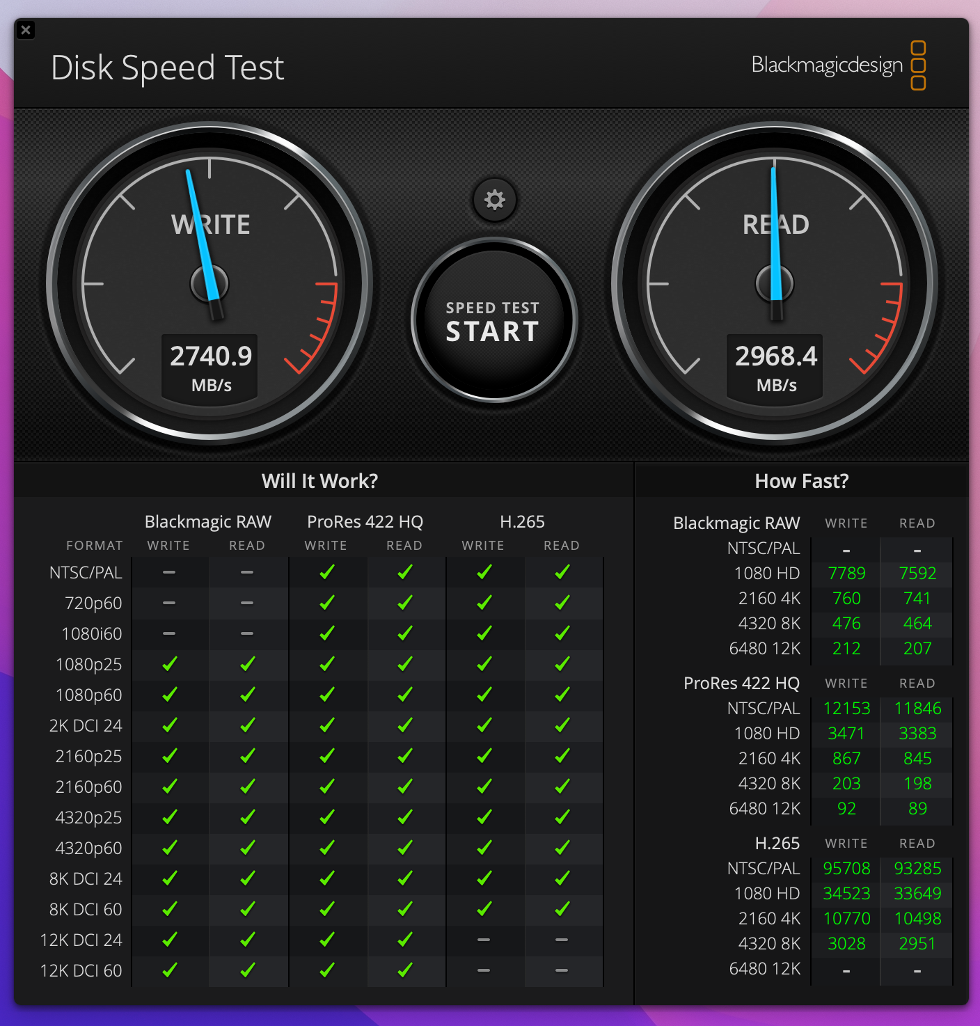 Below are the speeds recorded in BlackMagic Speed Test. The first is the 970 Pro on the Highpoint. The second is the T2 Drive: