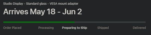 A total guess on my part but I always thought that “preparing to ship” meant you’ve been allocated a specific item (like monitor with serial number 1234567). Whether or not it’s a fully assembled product yet. With all the weird Covid stuff that has happened in China there could be stacks of monitors needing one specific part (like the height adjustment hinge). I’d hope that means you’ll be seeing it ship far ahead of your bumped back dates, but with all the Covid issues in China I wouldn’t celebrate until you have a tracking number.