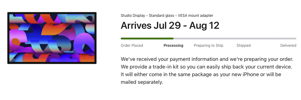 Mine is still at "Processing" and I don't see any charges on my credit card yet. I spoke to an Apple representative and my window is from the 2nd to the 16th, they confirmed I would have it by the 16th, but I am not holding my breath.