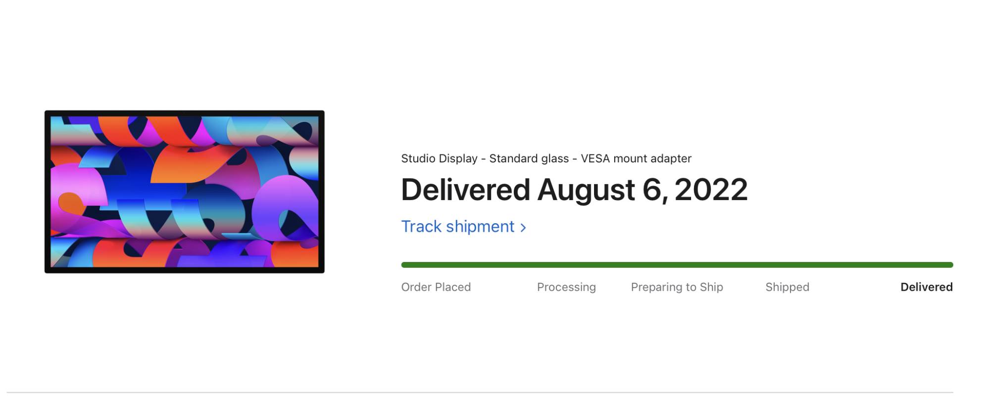 My Studio Display, VESA option, finally arrived in Los Angeles. It's absolutely gorgeous. Very happy with it.