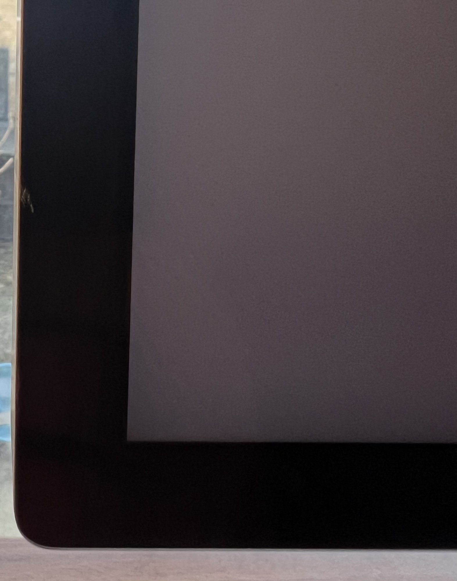 Purchased the standard tilt + height model 2 months ago, but discovered this small mark today as shown in images on the edge of the glass (the crack is behind the glass as it feels completely smooth to touch)