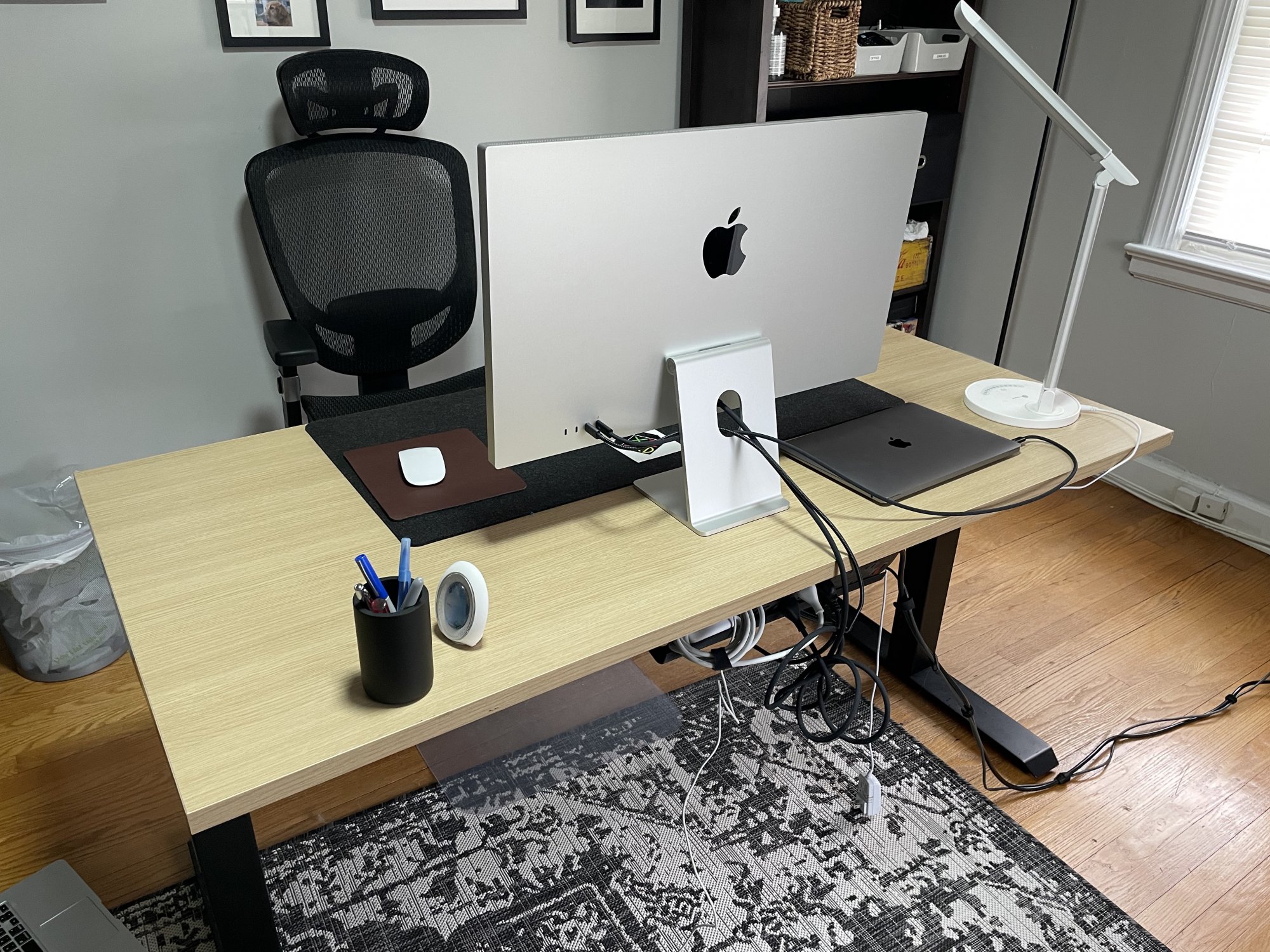I LOVE your setup!!! Great job! So stylish and yet functional! Congratulations!Here is my setup, still need to finish cable management. I changed everything in my home office this year. Went with clean, black and white. There was a lot of browns in here before.