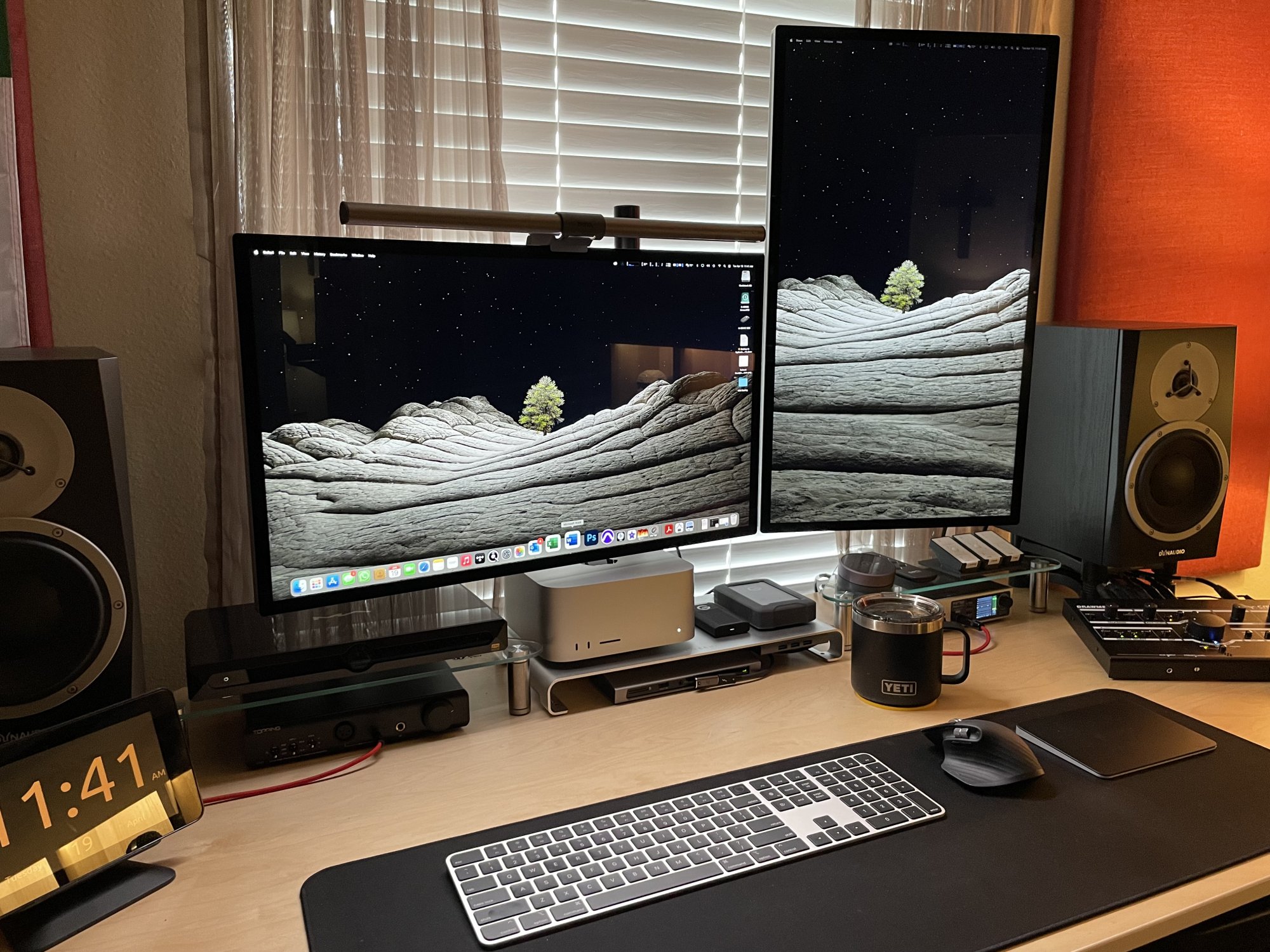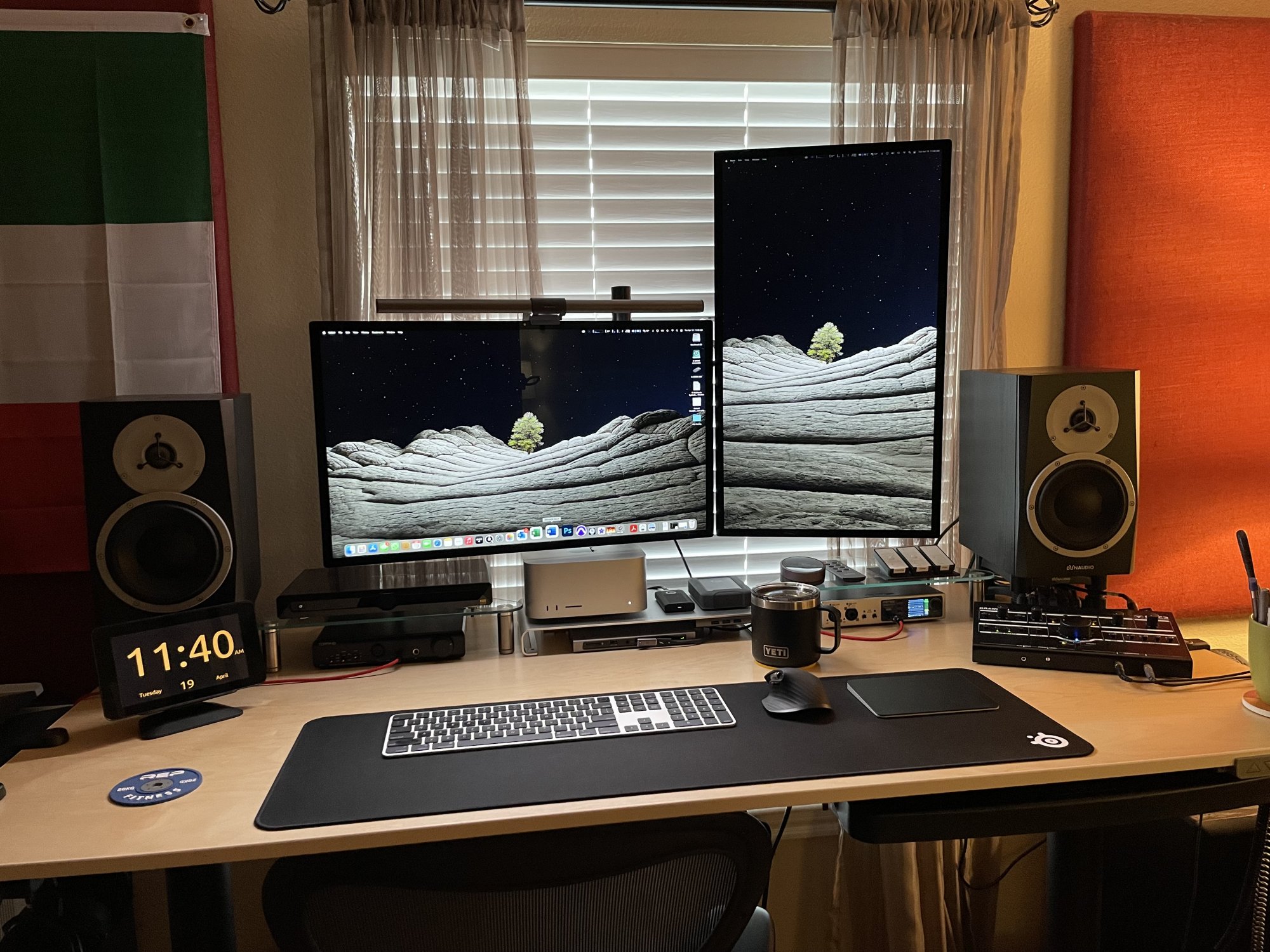 Oh wow, what a cool setup of a horizontal and vertical one.Ordered my pair of ASDs Standard Glass VESA Mount on April 9th from Best Buy with store pickup for April 20th and they came 1 day earlier so today went to the store and picked them up. They are up and running already. Firmware update went smooth on both displays at the same time. No yellow tint and they look AMAZING!!! I'm super happy now with my setup and have ZERO regrets going from a pair of 32" LG 32UN880-B to a pair of 27" ASDs. The sharpness and the colors are totally worthy the premium price. Already cancelled my order from Apple placed on march 31st and scheduled for May 27 - June 13.