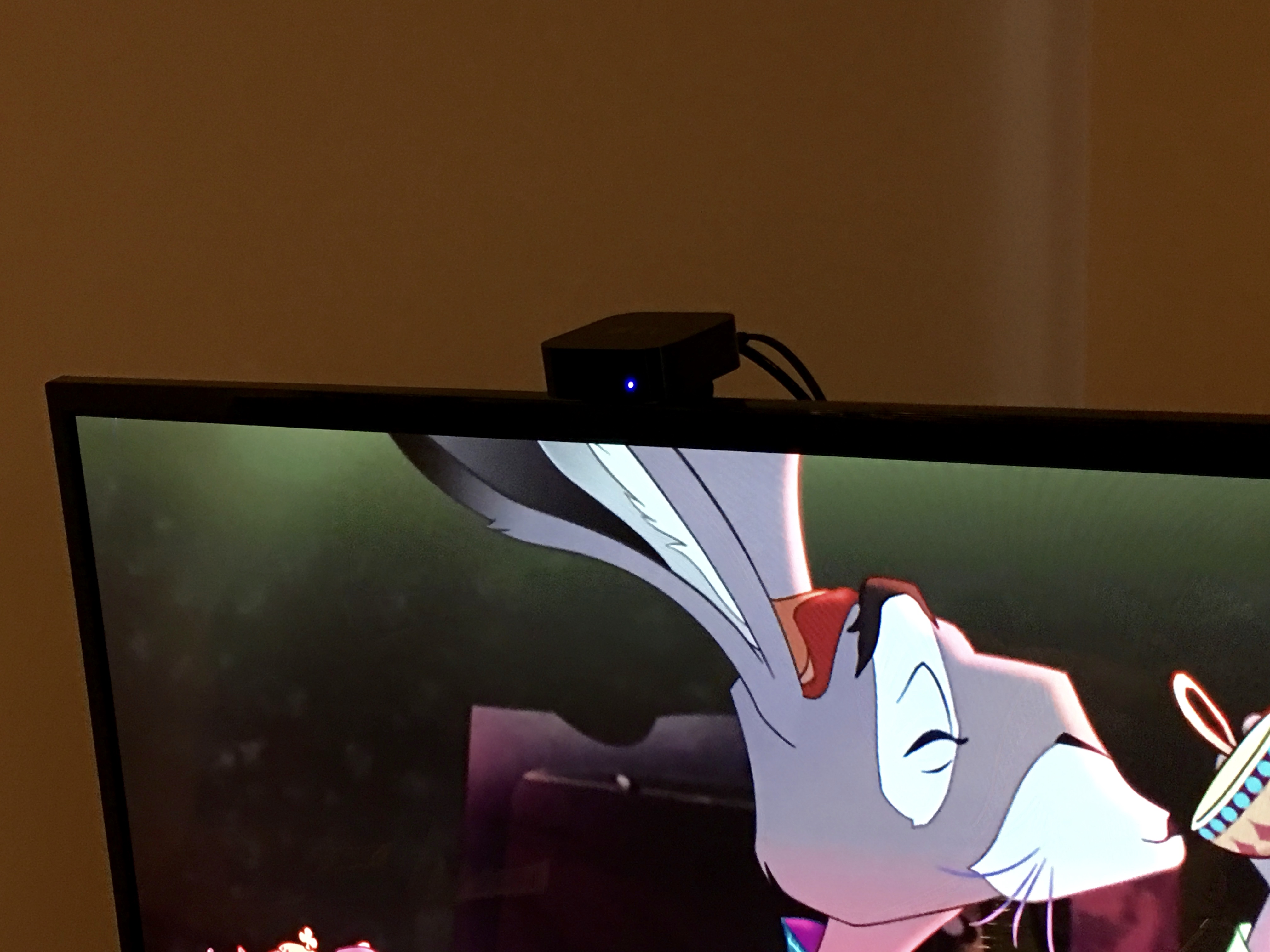 The photo is at a high angle to show the mount and the cables, but sitting right in front of the TV, it blends pretty well with the Samsung.