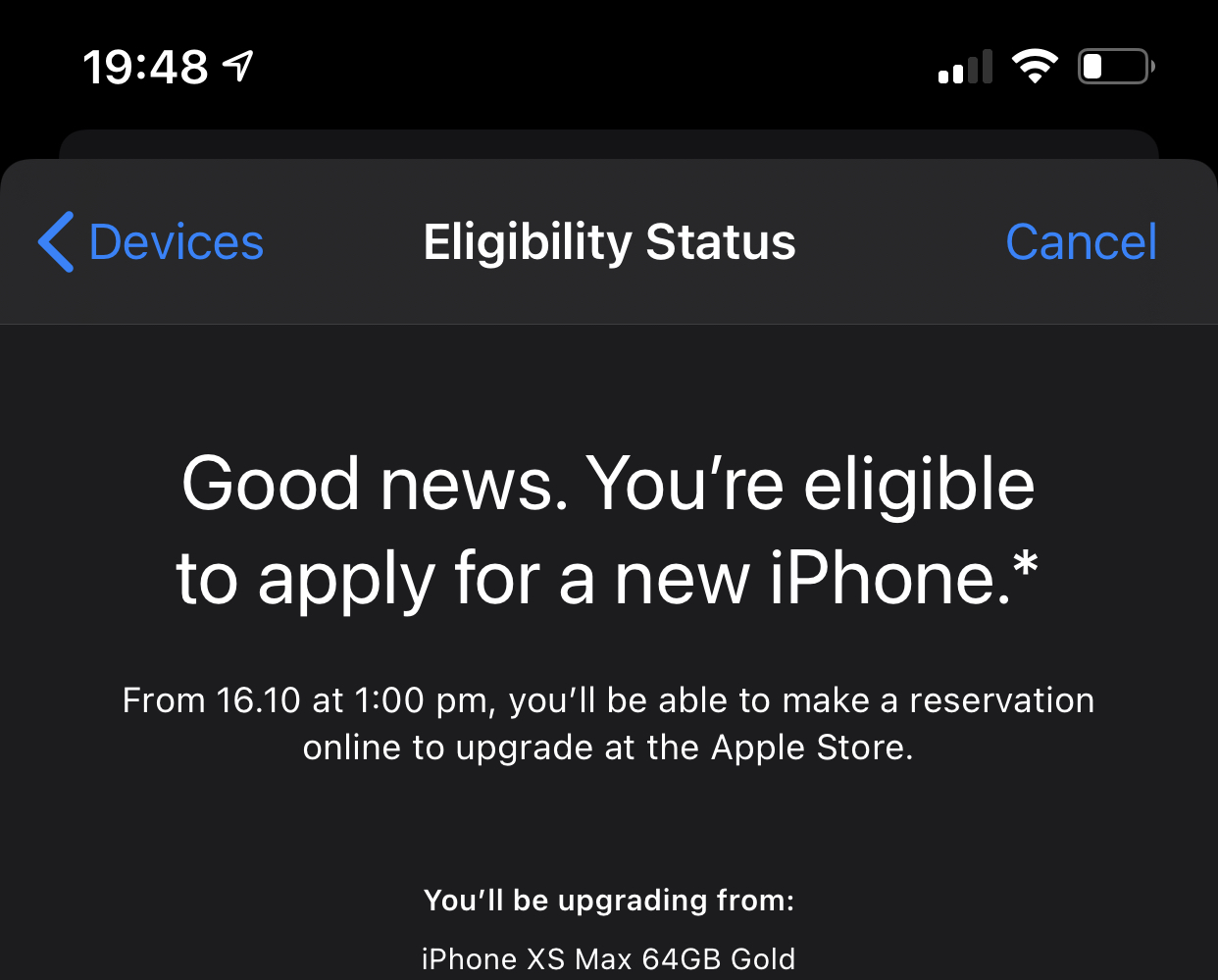 If you go to the apple store app, click on "For You" at the bottom and then scroll down to your devices you should see your phone and under that "Device Details." When I click on that it opens and I can see that my phone is eligible for an upgrade and it has link that says "start now".