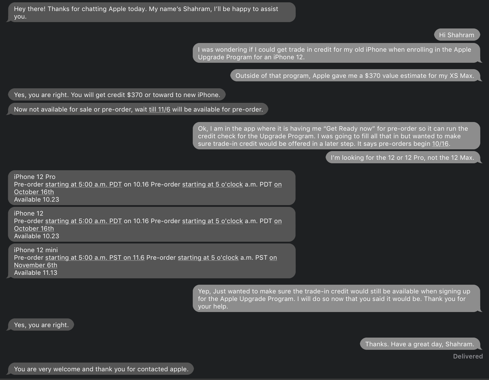 I had to go through the path of going to the page where you enroll in the Apple Upgrade Program. It will refer you to the Apple Store app on your phone to "prepare for preorder". I was wondering if at the end I could apply a trade-in value for my XS Max so I reached out to customer service. Here is a transcript of the conversation: