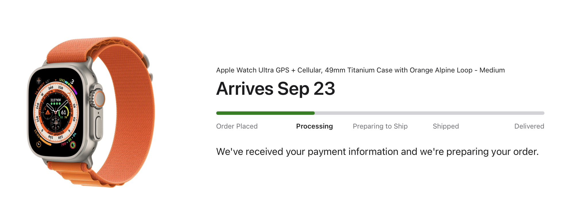 That’s strange. Didn’t a guy post on a new thread tonight that there were some issues at Apple and the orders were being lost or cancelledOrdered ultra alpine orange LG day on 05:05 PST, showed 9/23–XYZ, now shows 9/29/-10/6, wonder why there was a change after the fact.. no worries but still odd.