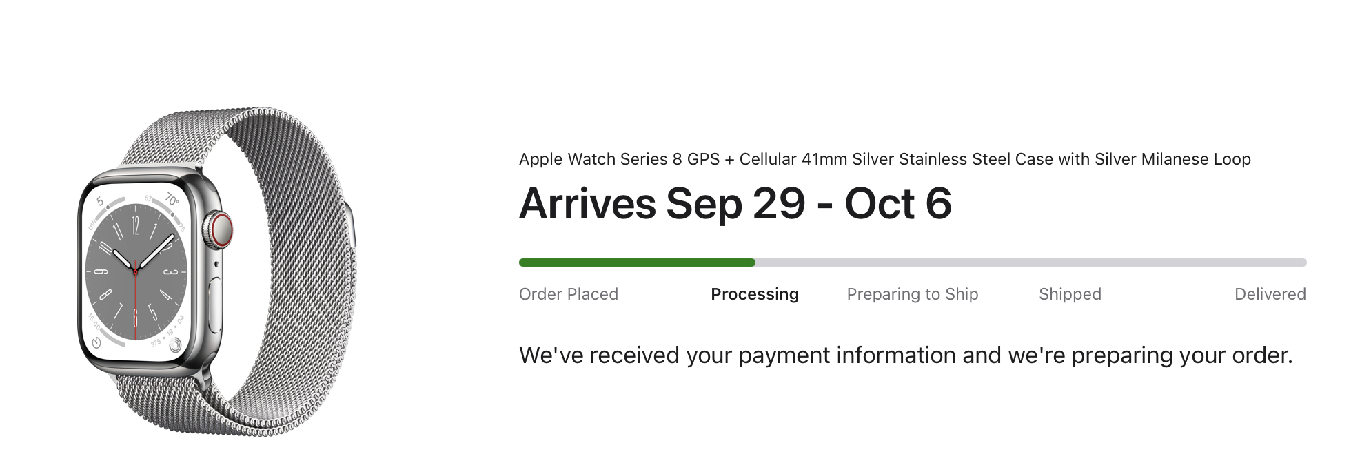 I’m in the same boat as you. I did preorder a bit later (Thursday) but delivery date is still the 16th. My watch is set on preparing to ship on Apple.Has anyone received any tracking number for there Apple Series 8 that are getting them on the 16 of september? that are in the USA- since I just want to see where its coming since looks like my iPhone 14 Pro Max has shipped but no my Watch yet