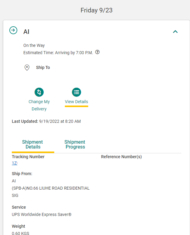 1) Logged into UPS My Choice > Tracking > View All Shipments...my AW shows up like this.