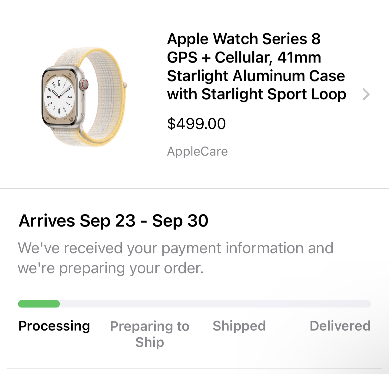 Thanks for sharing. That was only a week wait not bad! Hoping for movement tomorrow.Ordered my Series 8 GPS on the 11th and got it yesterday.