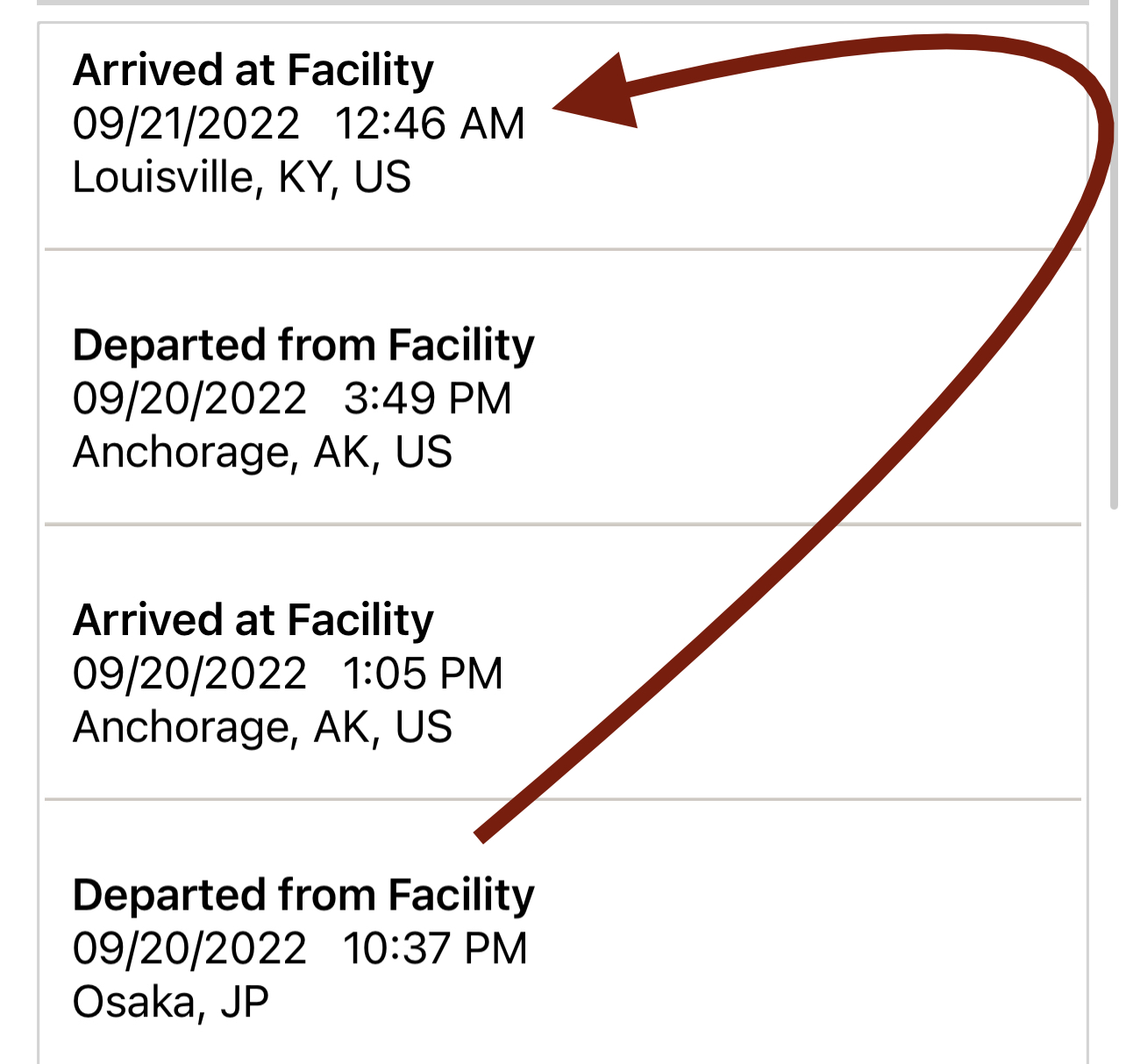 I got an arrival scan into Louisville.There’s a chance you might not see it until Thursday. Last week iPhones didn’t see any arrival scans. It went straight to import scan. Following up with the last departing flight to the destination.