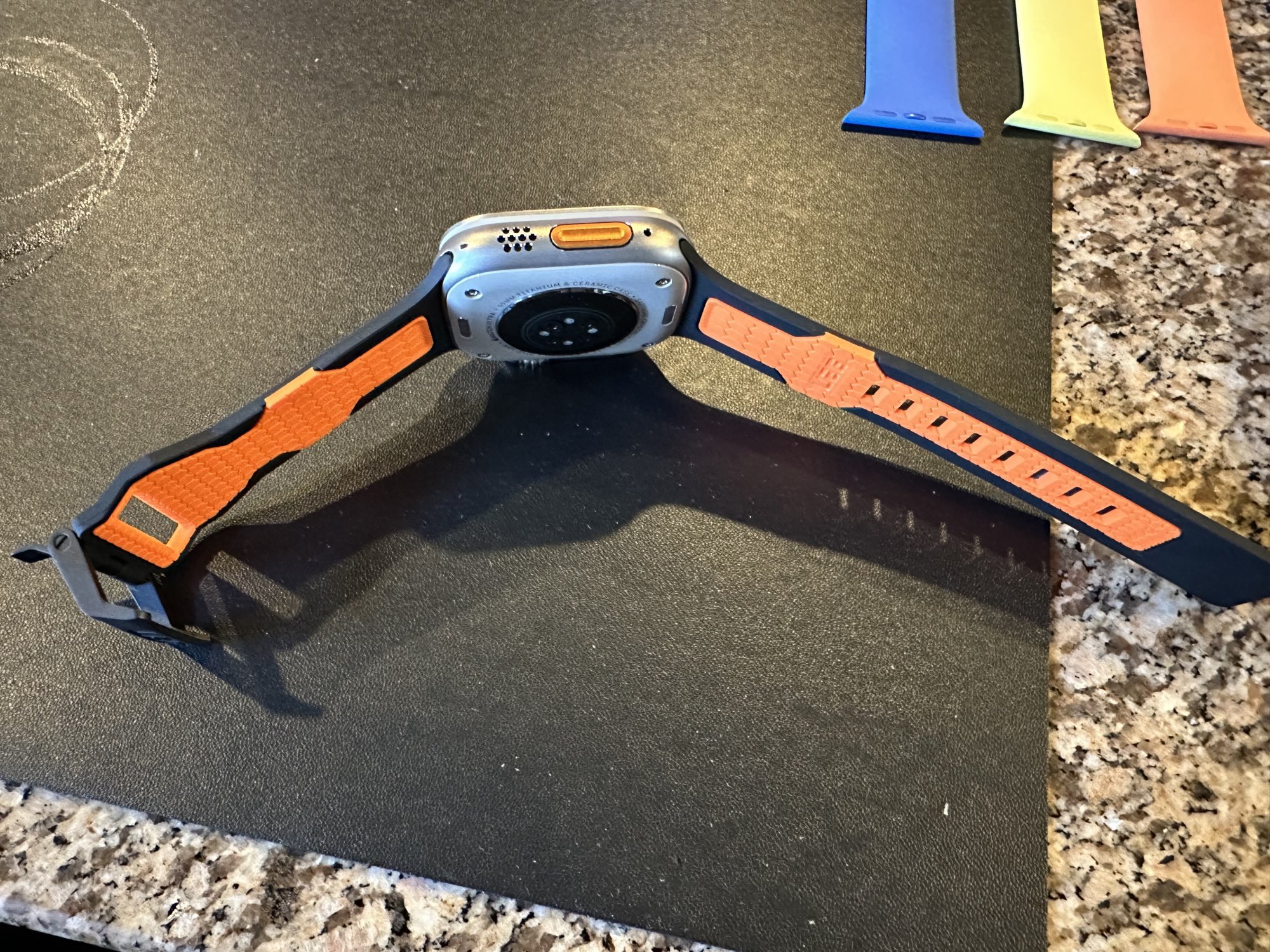 Apple Watch Ultra with gray/blue trail loop, being delivered outside Kansas City, KS between October 19-26th.