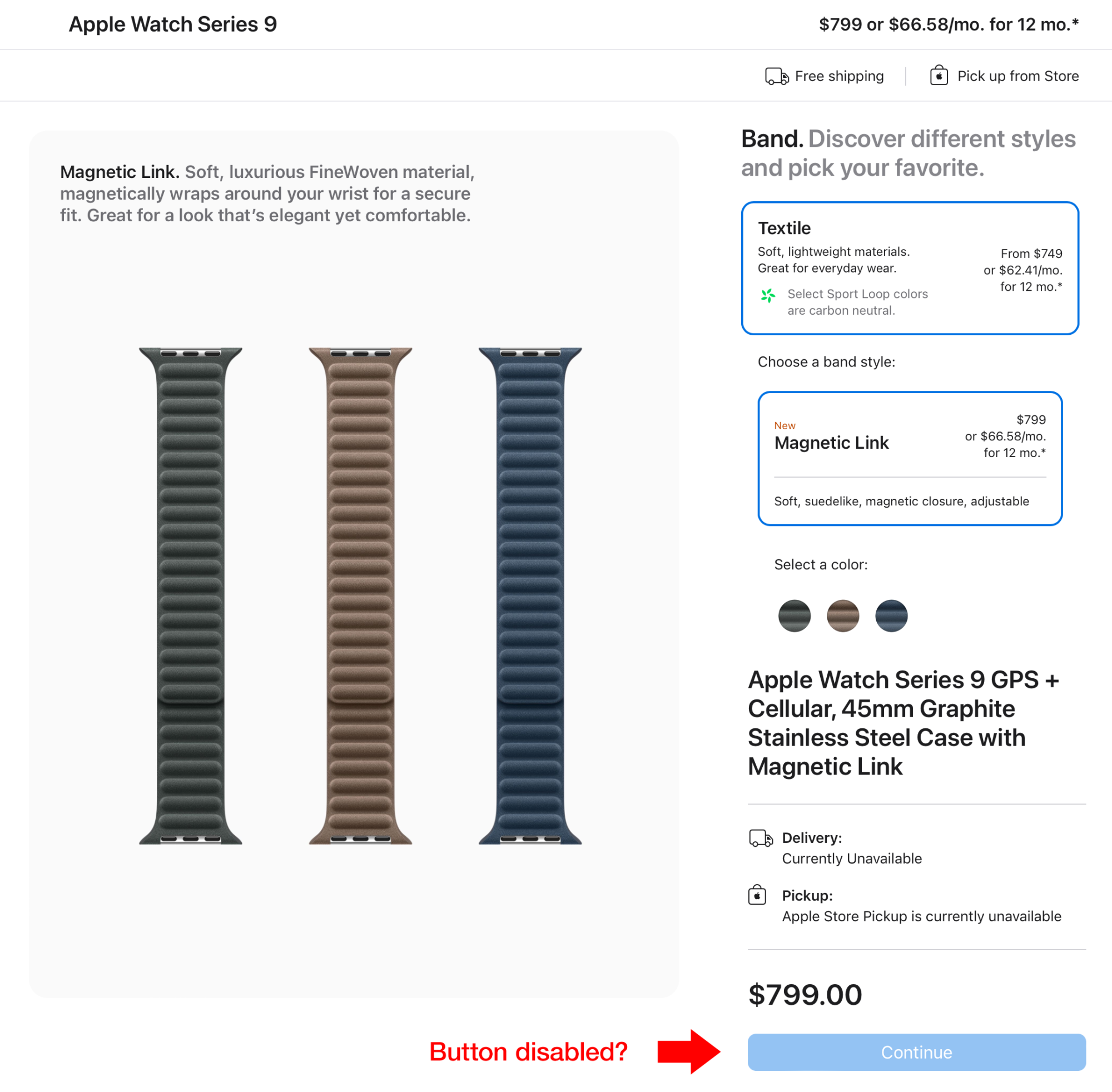You have to select a band color. Edit: Known issue, disregard.Is it just me, or is the Series 9 with Textile Magnetic Link unavailable to pre-order? "Continue" button is disabled and doesn't change to "Add to Bag". All other variations without the Magnetic Link are available.