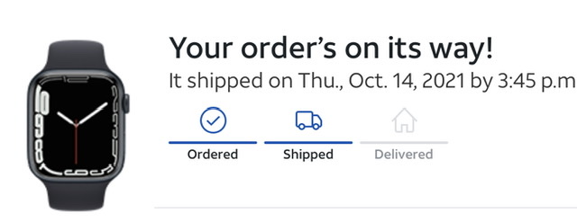 Interested to hear how this turns out for you. I placed an order this AM that was supposed to come Monday but then remembered about the $100 rebate I got from buying direct through Apple and cancelled. $100 is worth waiting a little longer. Hope yours comes ASAP!Just got an email from Walmart that my shipment date has changed to 12:00:00AM, when I click on it creates a calendar date for tonight. My account page says delivery Monday. Also when I look at the order page for watches again dates are pushed to a month from now when they were tomorrow as recently as this morning.