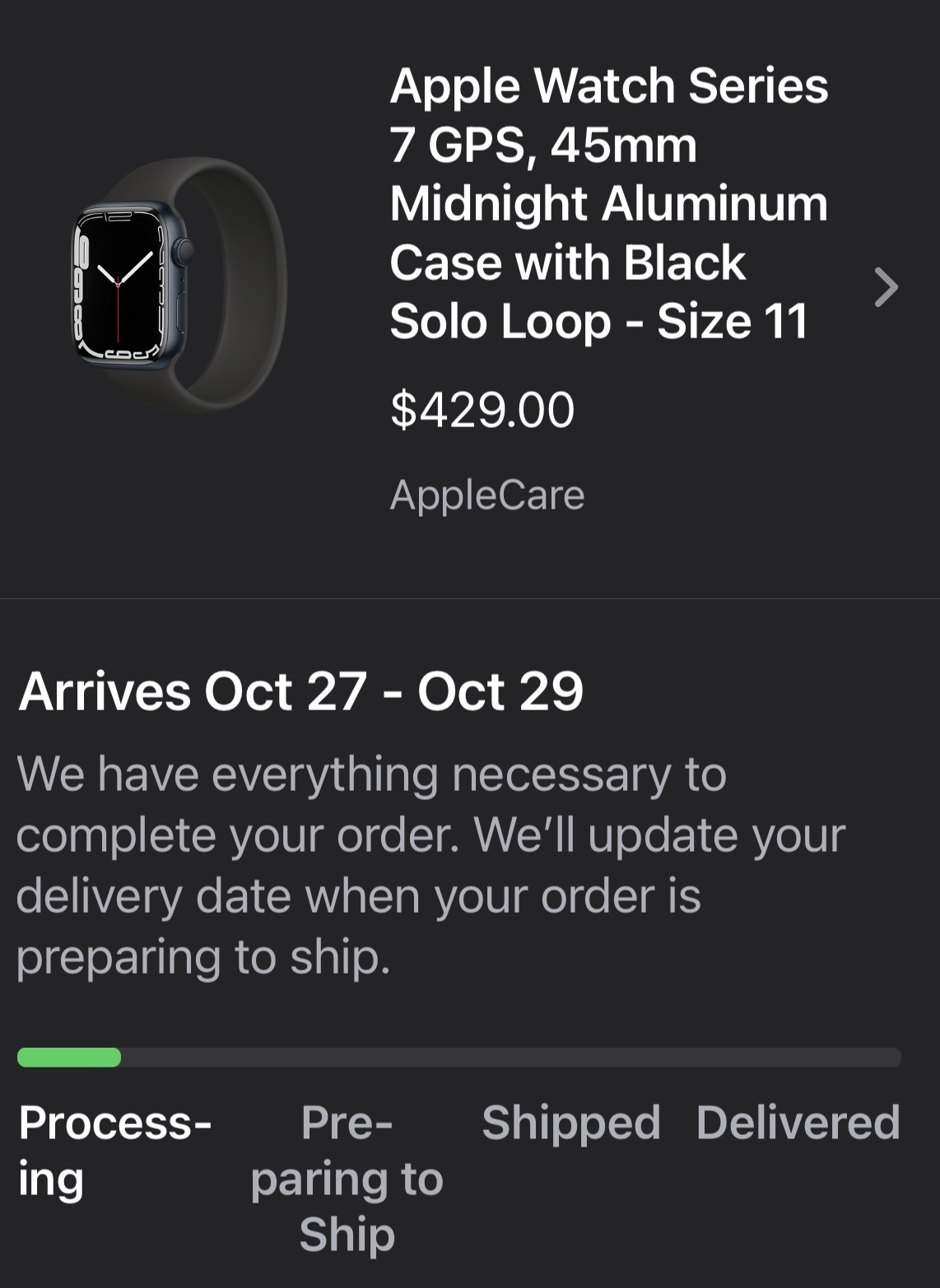 This is my status, it was changed late Wednesday evening after saying it would be here today. They say they have everything for my order, if that’s the case then just ship it already.I ordered a 45 mm midnight aluminum with midnight sport band with delivery supposed to be today. My card was charged days ago, but it stills says preparing to ship and has changed to "Arrives 3-5 business days." Bummed.![]()