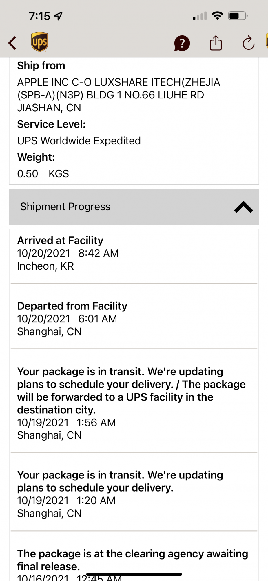 Ok i was correct about my aw7 leaving on UPS81 which arrived in Incheon Korea a short time ago