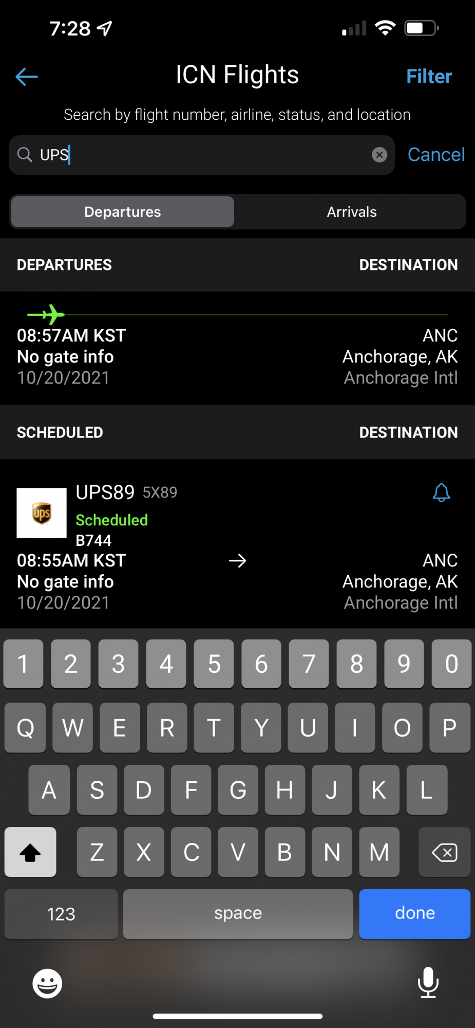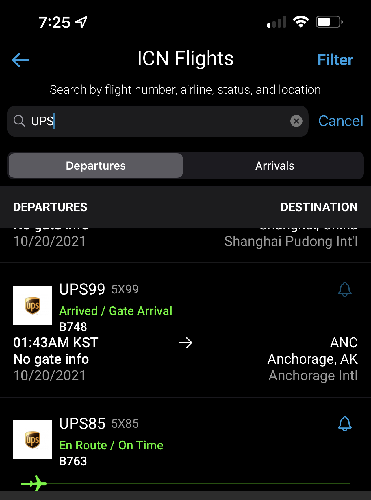 Now watching for the departure time from Incheon and then find what flight will be going to Anchorage next Likely a UPS flight as well. The next flight for Anchorage is soon UPS89 I am guessing that will be the flight but we shall see for the fun of it.