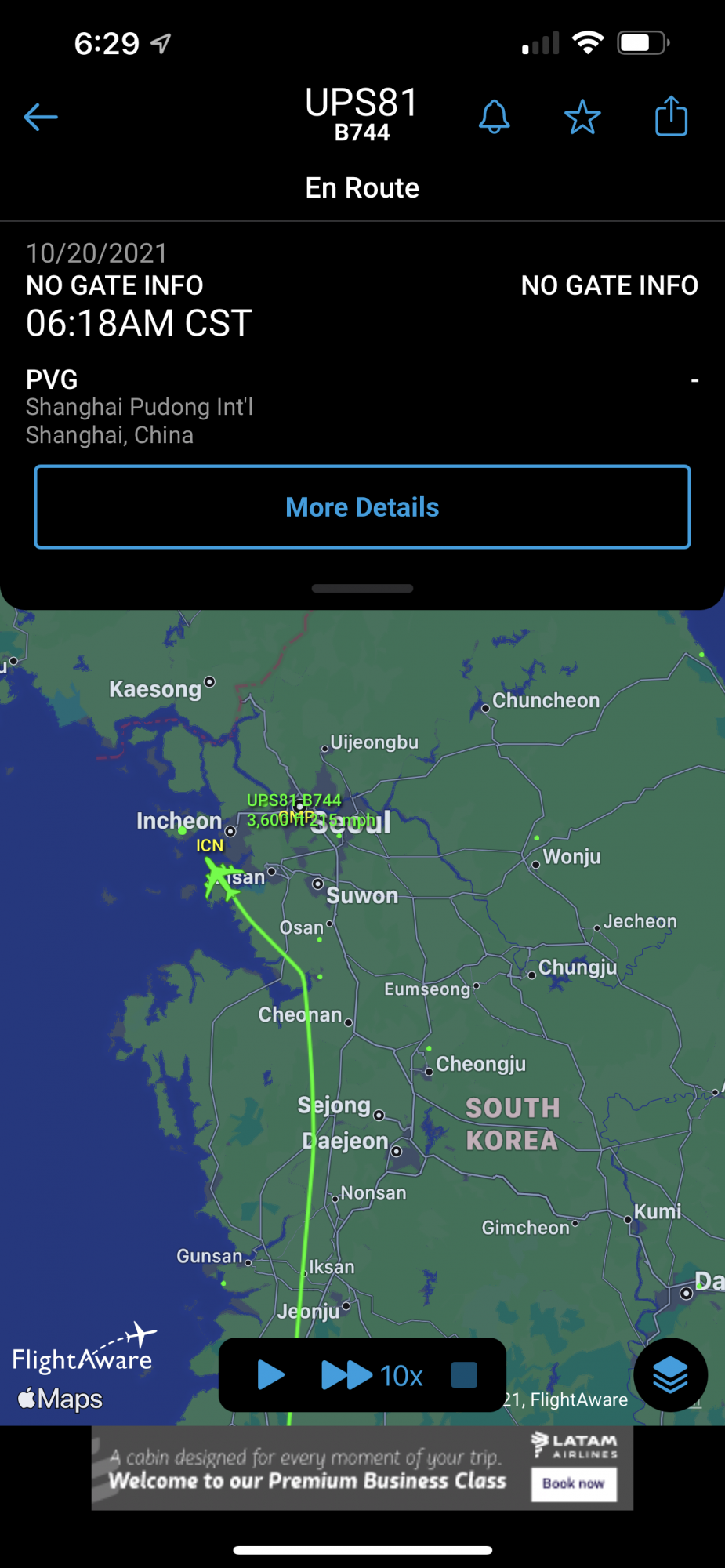 I used the Flightaware app. Looked at Shanghai to see what planes left after 6:01 am China time. I actually found two UPS flights and the one closest was UPS81 that arrived after hour and half in Incheon.