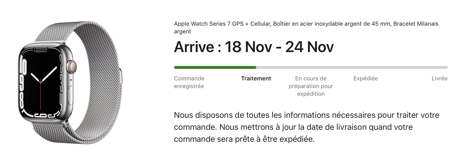 Should be imminently changing, normally a (new?) credit card charge just before.Midnight 45mm Aluminum, ordered two with Cellular, still on Processing for a delivery "between November 3 and 10", so hopefully those dates remain accurate.