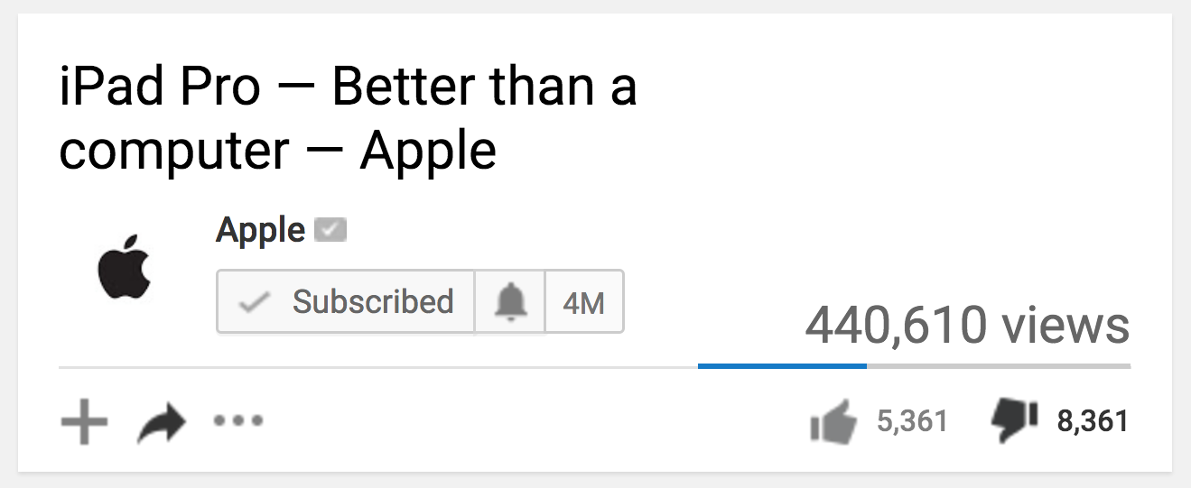 The iPad Pro 'better than a computer' ad has beaten the previously least liked video - the 'What's a computer?' iPad Pro ad ("least liked" meaning worst like to dislike ratio).