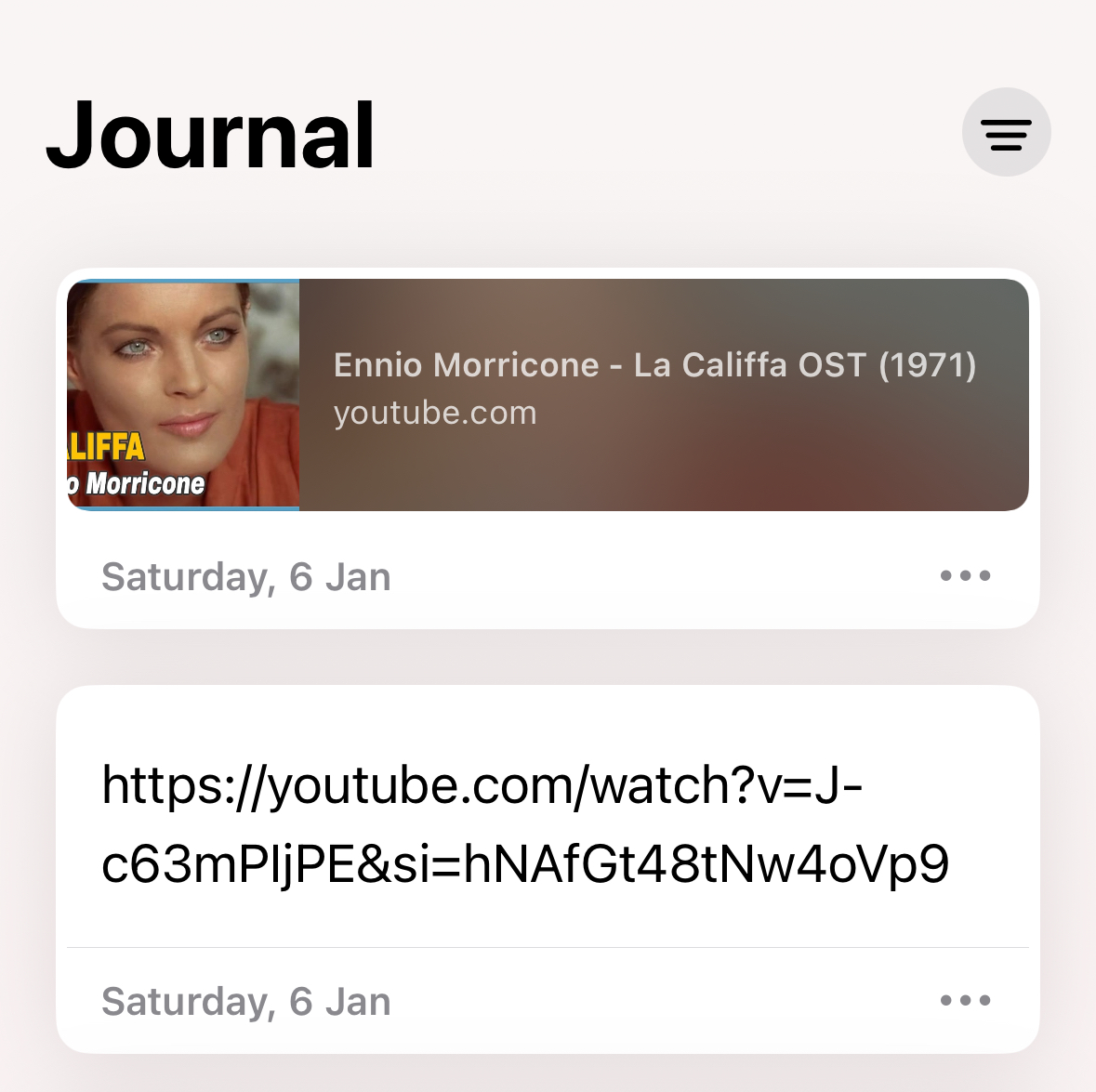 The difference between sharing a YouTube video to Journal from the app (bottom) and from Safari (top).