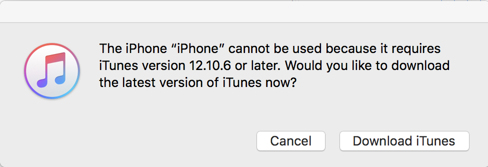 "The iPhone [____] cannot be used because it requires iTunes version 12.10.6 or later. Would you like to download the latest version of iTunes now?"