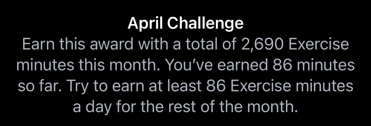 That's pretty intense (more than two hours a day in March)! Hope that the COVID didn't hit you too hard. I had COVID about a year ago and was pretty beat up by it and still can sense many smells. I had a similar challenge in March, 2080 minutes, that I completed with a total of 2480. This month I got this:I got COVID and failed last month so hoping for better luck this time. Interesting to see what difference that one failure makes - I had exercise minutes in February too, but 3810 then compared to this month’s 2890.