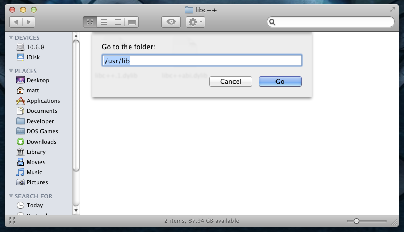 In the Finder, do +Sft+G (Go to Folder), enter “/usr/lib”, drop the two files in that folder, restart.I looked into that, but haven't quite figured out just how to do it. When I unzip the downloaded files, there are libc++.zip files, which when unzipped, create libc++ folders, which contain files, but I don't know how to put them in the /usr/lib folder, or even where that is exactly . . .