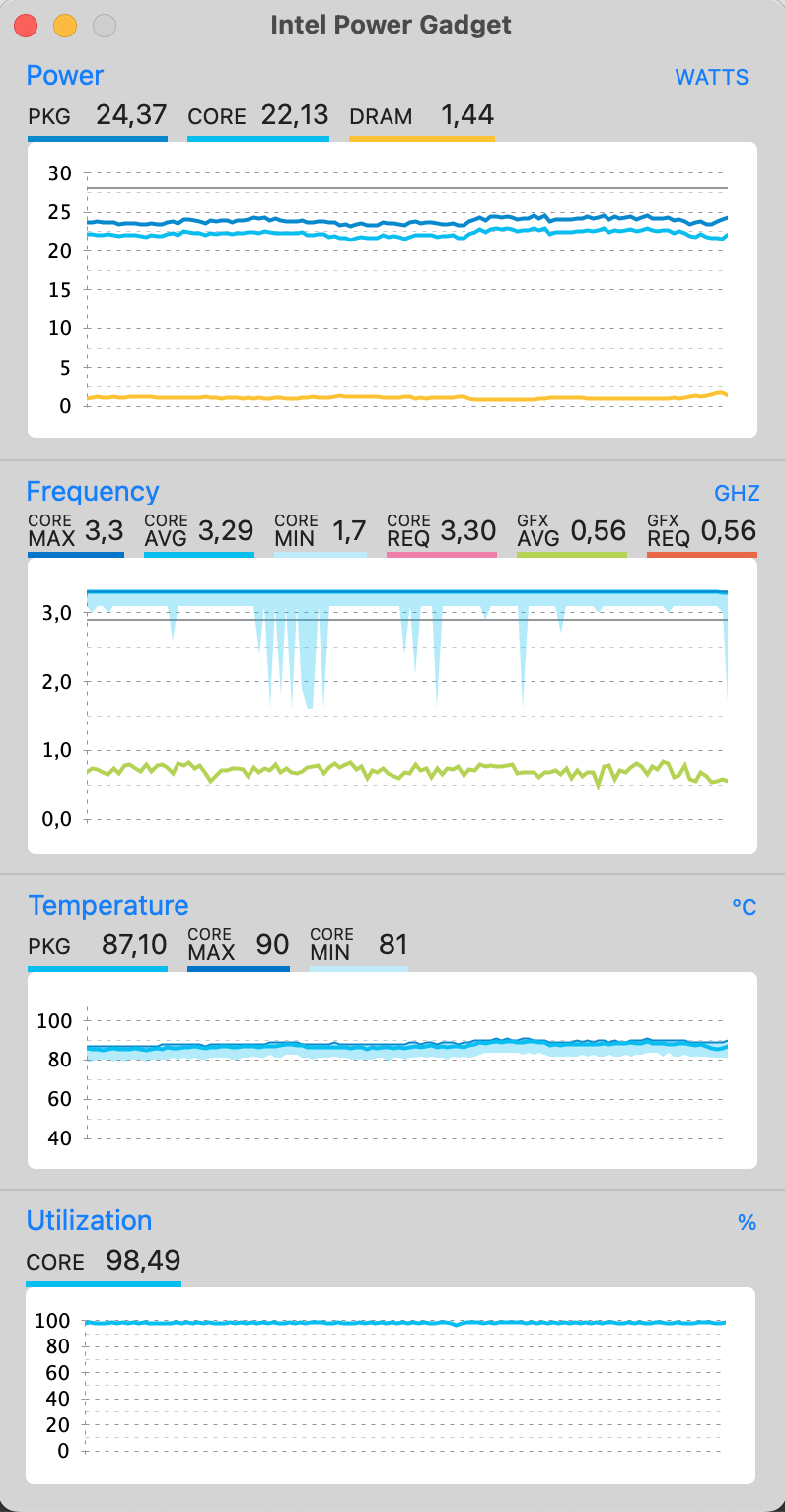 As you can see my MacBook maxes out at 90°C with Full CPU load. With stock paste it throttled down below base clock.