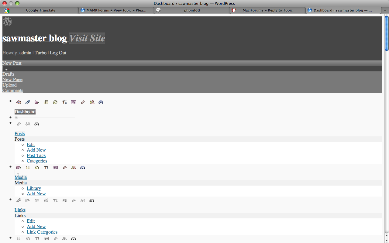 - In the admin panel of wordpress, the dashboard is "jumbled up". When I use the Web Inspector in safari 4, I get two syntax errors in 2 diffrent javascript files. Both javascript scripts have a crapload of symbols that can't even be displayed.
