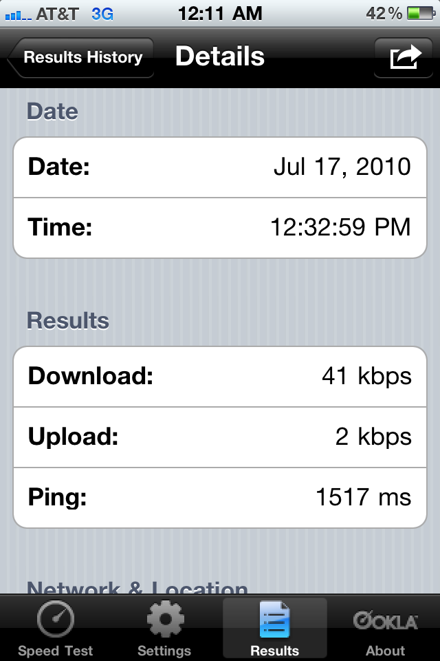 I have a screenshot from shortly after I got the iPhone for of my speediest on 3G. I got 3553 down, and 1653 up. Now, 1940 down and 98 up. What's the story? I'm sorry, I dont have time to read through the whole thread. Will it do any good notifying AT&T?
