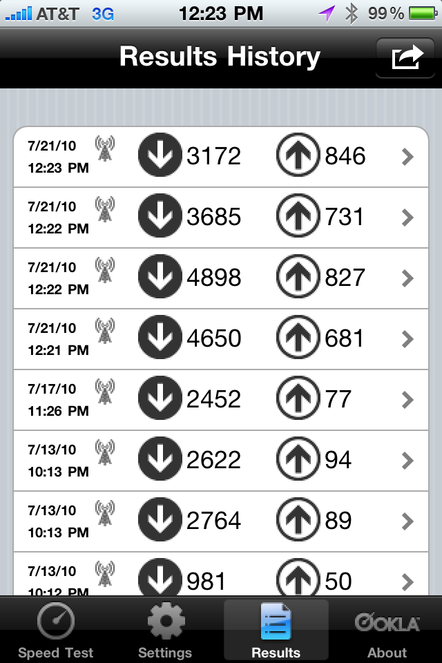 On Verizon, I'm averaging about 800-1400 kbps down and 600-800 kbps up. This may seem like a downgrade - and in terms of raw throughput, it is - but there's more to the story! Apparently, the CDMA network has significantly lower latency, which can be demonstrated when doing the speedtests with the Speedtest.net app.