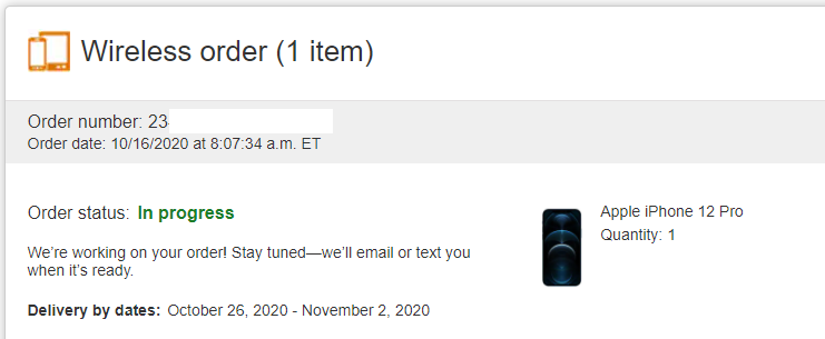 Order completed 7:59a. Pro Pacific Blue 128gb. Still showing a estimated delivery date of Oct 26 - Nov 2nd which is concerning.