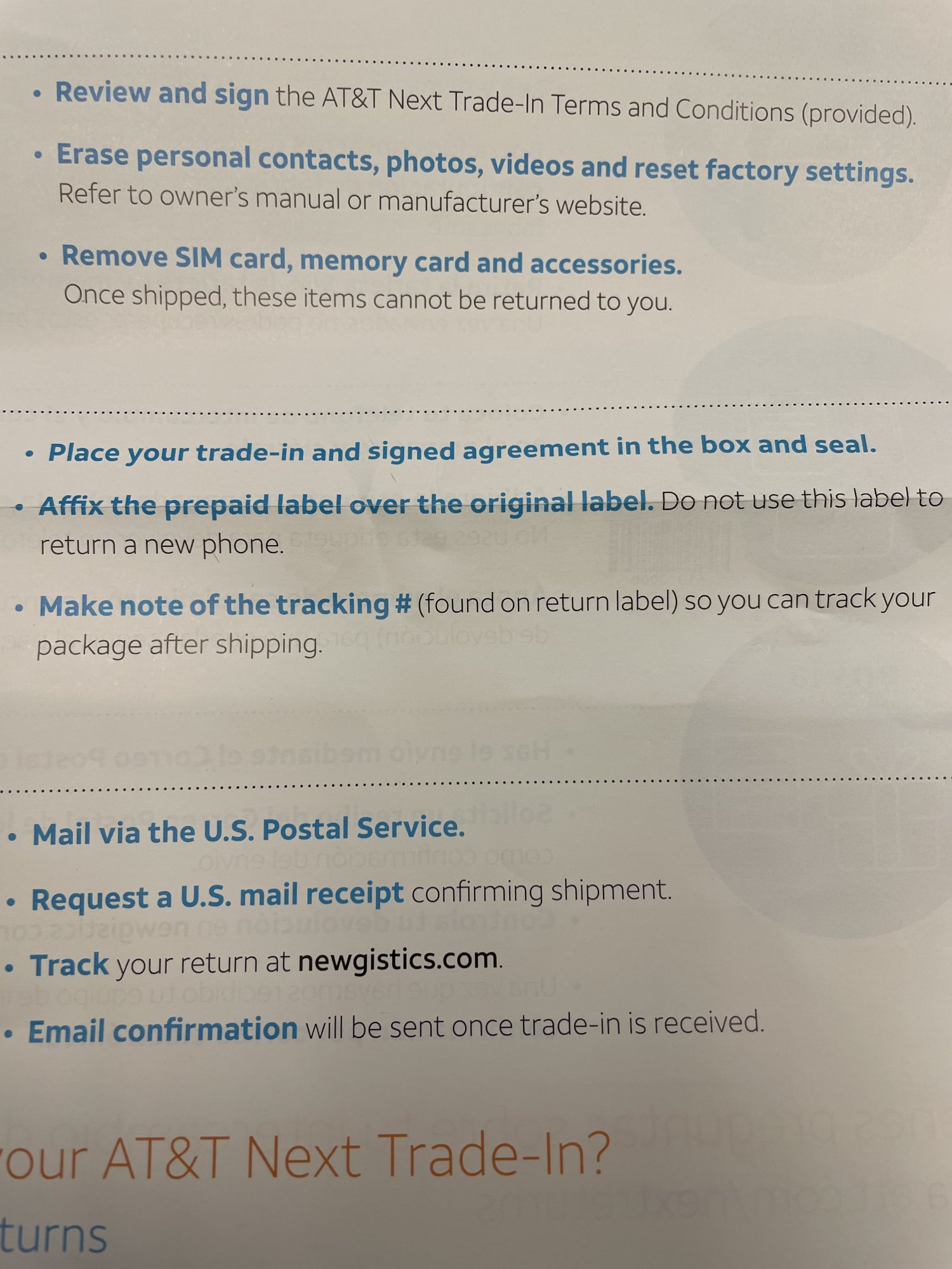 Specifically said, "do not use this label to return a new phone"I only received a label to return my trade in. It was addressed to a 56901 zip code. There were instructions on the return process in my box. There was also a form to sign and return. You might want to double check with ATT before sending it off.