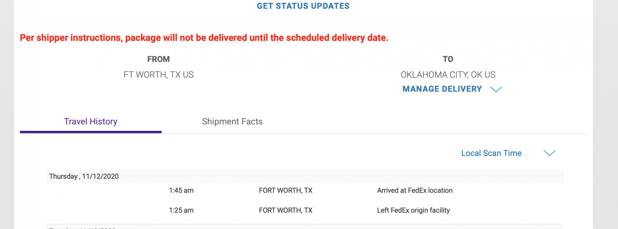 Lol.. mine's in Ft Worth too. Left at 12:21am and arrived at 12:41am.. HAHA. Looks like we're in the same metro.