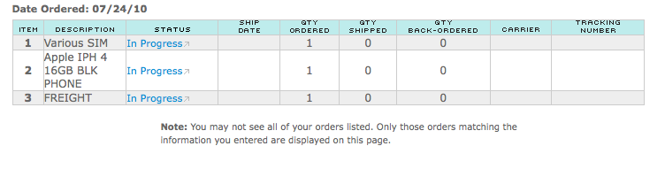 I ordered an iPhone 4 16 GB on 7/27, premier, AT&T store. It came off B/O 8/4 at 8:00 AM. No shipping info yet.