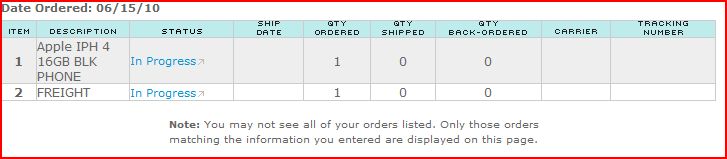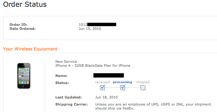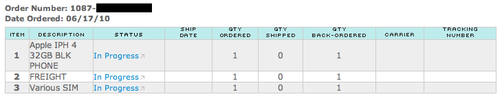 However, a quick trip over to the myWireless Order Status page (after punching in my phone number, as the order number pulls nothing up) shows a different order number than my Premier email, and even more frustratingly, backordered with a date of June 17th that's entirely and wholly inaccurate. Furthermore, that's beyond the rumored cutoff for launch day shipments, and I'm (as of now) still without any hope of a tracking number.
