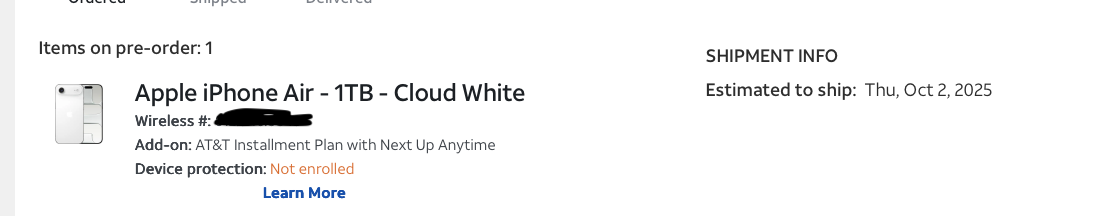 AT&T does not combine multiple iPhone devices in a single shipment. Do you see that they both are even shipping from the same location?Got a shipping notice from ATT for my 17 base. It’s the UPS order. Nothing about my 17 PM. So strange they are using two shippers for one order.