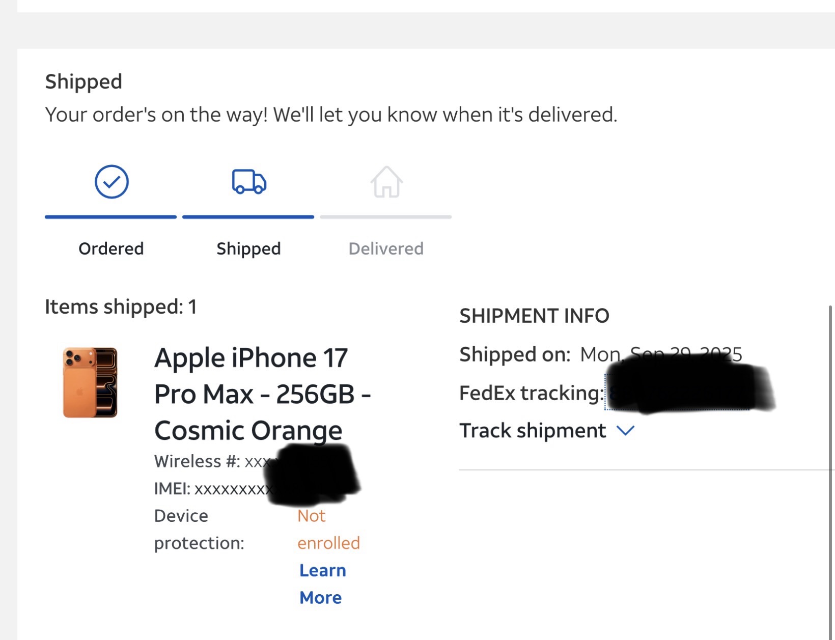 Well update on my order for the iPhone 17 pro max part at least it got canceled. Apparently I updated my payment method for the tax that was due on the device which the original payment method declined. It didn’t get attached somehow to order and it got canceled. I’m still trying to figure out what to do from here because when I check my order status, it does not show up It was canceled. but when I call in, they say it was canceled. on my end it still shows ready to ship as they have taken the $78 for taxes. Very annoyed and frustrated. and if I have to place a new order, I can’t place one until it’s canceled properly. Otherwise I’ll have to put a down payment on the phone, which I do not want to do. apologies if I’m confusing anyone