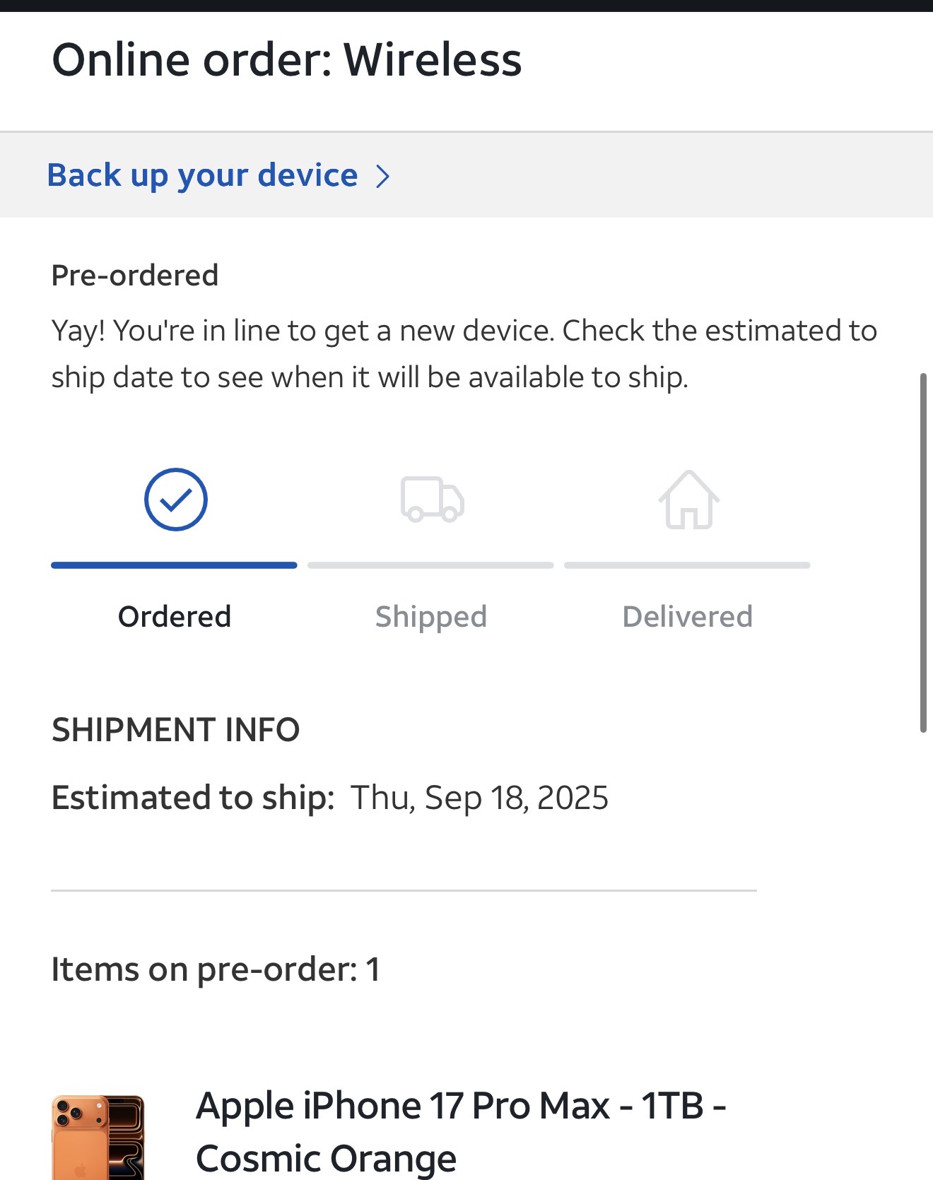 On Friday, I preordered my first iPhone ever after 15 years on Android (17 Pro Max, Orange, 256GB). AT&T updated pretty quickly yesterday and said it was ready to ship by about noon eastern, but still haven't seen it come up on FedEx. I know it's probably nothing but I'm impatient and excited about a new phone for the first time in years
